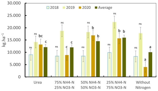 Influence of different nitrogen forms on coffee productivity after stem trimming. Different letters denote statistically significant differences according to Fisher’s LSD test alpha = 0.05; ns: not significantly differences.
