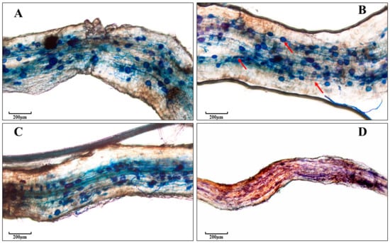 Examples of arbuscular mycorrhizal fungi in apple root tissue: Rhizophagus irregularis (A), Claroideoglomus claroideum (B), Claroideoglomus etunicatum (C), and Septoglomus deserticola (D). Roots were stained with trypan blue and viewed at 100× magnification. In (B), red arrows indicate representative structures (from left to right): arbuscules, vesicles, and intracellular fungal hyphae. Scale bars: 200 µm.