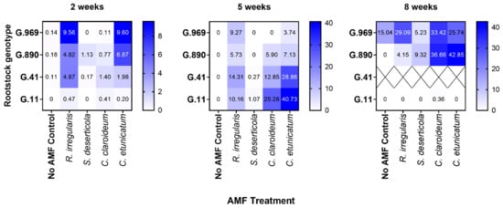 Mean percentage of root colonization in four different apple rootstock genotypes inoculated with four different species of AMF in Experiment 2. Heatmaps are shown for 2, 5, and 8 weeks post AMF inoculation, respectively. Data represent the mean of three biological replicates (× three technical replicates each) per rootstock × AMF combination per timepoint. G.41 could not be included in the 8-week analysis due to an insufficient number of plantlets.
