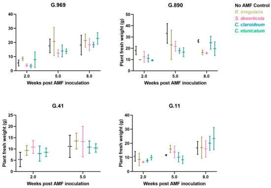 Mean plant fresh weight of apple rootstock genotypes used in Exp 2 and inoculated with four different species of AMF. Data represent the mean of three biological replicates (× three technical replicates each) per rootstock × AMF combination per timepoint. G.41 was not included in the 8-week analysis due to insufficient plantlets. Error bars show standard deviation.