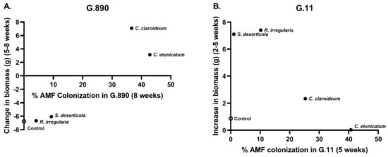 (A) Relationships between % AMF colonization in G.890 at 8 weeks post-inoculation and the change in plant biomass between 5 weeks and 8 weeks (Exp 2). (B) Relationship between % AMF colonization in G.11 at 5 weeks post-inoculation and the increase in plant biomass between 2 weeks and 5 weeks (Exp 2). Each point represents the mean of three biological replicates (×three technical replicates each).
