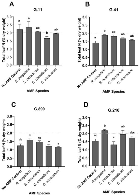 Total foliar N (% of dry weight) in the apple rootstocks (A) G.11, (B) G.41, (C) G.890 and (D) G.210 inoculated with different species of AMF, 5 weeks after inoculation in Exp 1. Letters indicate statistical differences (p < 0.05) in total leaf N observed according to two-way ANOVA followed by Tukey’s multiple comparisons test. The dashed horizontal line indicates adequate N nutrition (>2.0%). Data represent the mean of three technical replicates pooled from seven biological replicates.