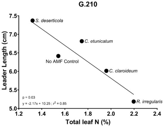 Linear regression analysis showing a significant negative correlation between total leaf nitrogen (% of dry weight) and leader shoot length (cm) in G.210 (Exp 1) depending on which species of mycorrhizal fungi the plant was inoculated with (y = −2.17x + 10.25; r2 = 0.85). The slope of the line is significantly non-zero (p = 0.03). Each point represents the mean of seven biological replicates for leader shoot length and the mean of three biological replicates for total leaf N.