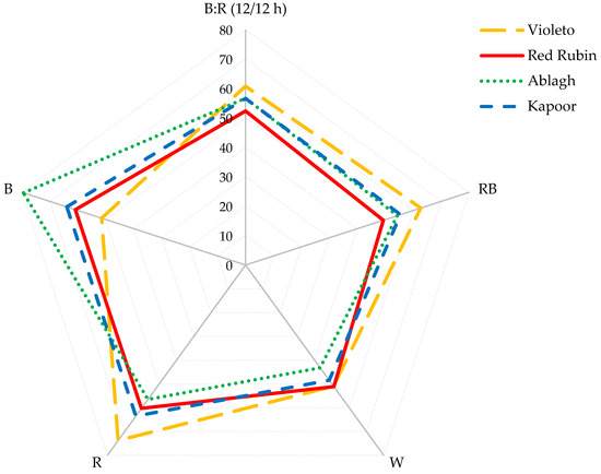 Light is one of the most important environmental factors controlling plant growth. Not only is light the source of energy for carbon fixation in plant photosynthesis, but the light spectrum (LS) also alters plant morphology and the synthesis of secondary metabolites (SEs) through regulatory effects on morphogenesis, physiological metabolism, growth and development, gene expression, total antioxidant capacity (TAC), and enzyme activity [1]. The most important LS used in today’s plant factories are blue (B) and red (R) light, as these spectra have the greatest effect on photosynthesis, the accumulation of TAC, and the production of pigments through their effects on stomatal opening, electron transfer, and Rubisco activity [2]. The use of LEDs as the primary light source in plant production factories allows customization of the LS to meet plant goals and optimize biomass and SE production [3].