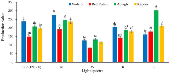 The simple effects and the interaction of LS and Cv on production value were significantly different at the 1% level. The highest production value was observed in the Ablagh genotype grown under B light, which showed an increase of 253.63% compared to the Red Rubin Cv grown under W light (Figure 2).