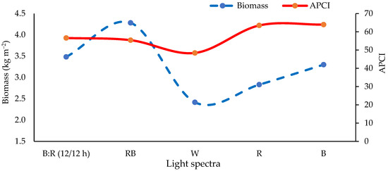 As shown in Figure 3, the best balance between biomass and APCI was obtained with the RB light treatment, whereas the poorest balance rate was obtained with W light.