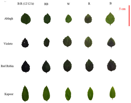 The image of the second leaf of different cultivars of basil microgreen under different light spectra. B: R (12/12 h day/night) = Blue light 12 h + Red light 12 h, RB = Red + Blue continuous light, W = White continuous light, R = Red continuous light, B = Blue continuous light.