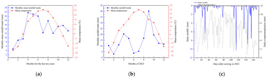 The field trial was conducted on Huaxing Farm (44.22° N, 87.29° E, 31 m altitude) in Changji City of the Xinjiang Uygur Autonomous Region. The field experiment data were collected from April to October in 2023. The average annual rainfall in the experimental site was 190 mm. The effective accumulated temperature was 3450 °C, and there were 160 to 190 frost-free days during the whole year. In addition, the soil properties and the meteorological data in the testing field were shown in Table 1 and Figure 1, respectively.