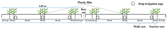 The plant material was ZhongMian 113 (Gossypium hirsutum L.) which was one of the local recommended cotton varieties. It had the characteristics of extra early maturing and high fiber content. The cotton was sown on 23 April 2023 and harvested on 15 October 2023. Its cropping pattern was under-mulch drip irrigation as shown in Figure 2. Three tubes were laid out in six cotton planting rows with one mulch film (66 cm + 10 cm), and a wide–narrow row was present. The plants were divided into wide (66 cm) and narrow (10 cm) rows. The plant spacing was 8 to 10 cm and the sowing density was 210,000 plants per hectare.