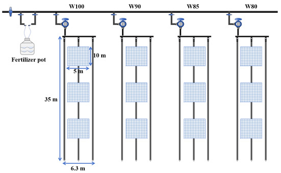 All of the experimental plots were 35 m in length and 6.3 m in width, as shown in Figure 3. There were three sampling areas in each experimental plot as a repetition, which were located in the front, middle, and rear sections of each plot, respectively. Each sampling area was 10 m in length and 5 m in width. During the flowering and boll setting stage of cotton, the plants were measured every seven days in each plot.