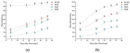 Changes in cotton plant height (a) and stem diameter (b) under different irrigation treatments. Note: different lowercase letters indicate significant differences within different treatments (p < 0.05).
