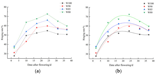 As shown in Figure 6, the ringing rate showed a trend of initially increasing and then decreasing, with a significant early stage increase and a smaller decrease in the later stage. Its peak value was primarily around the 25th day after flowering.