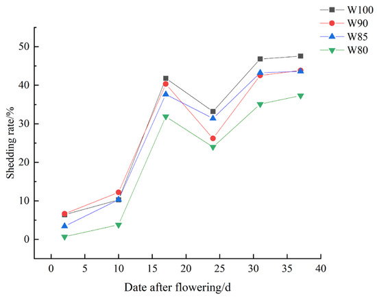 As shown in Figure 7, the shedding rate exhibited a pattern of rapid increase followed by a decrease, then a slow increase, with its lowest value also primarily around the 25th day after flowering. Compared to the control, it gradually decreased with the reduction in irrigation levels, and there was a greater reduction in shedding rate with the more water deficient treatments (Figure 7).