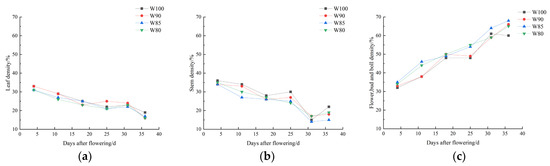 The changes in the biomass proportions of various organs of cotton under different irrigation treatments. (a) The biomass proportions of leaves; (b) the biomass proportions of stems; (c) the biomass proportions of flowers, buds and bolls.