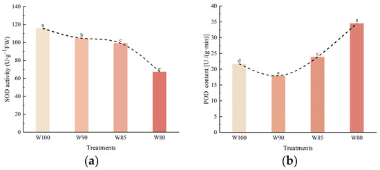 Compared to the control, the SOD activity of the functional leaves of cotton slightly remained stable in the mild water deficit, but showed a decreasing trend in the other water deficits (Figure 9a). Figure 9b showed that the POD content exhibited a trend of initial decrease followed by an increase with the reduction in irrigation levels.