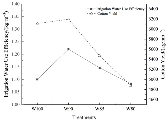 Through the analysis of cotton yield and irrigation water use efficiency under different irrigation treatments, the results indicated that cotton yield and irrigation water use efficiency exhibited a similar trend (Figure 11). With the decrease in irrigation levels, the cotton yield and irrigation water use efficiency of each treatment was W90 > W100 > W85 > W80. The W90 treatment showed the highest irrigation water use efficiency and yield, reaching 1.22 kg/m3 and 6196 kg/hm2, respectively. It needed to be noted that the results were preliminary of the cotton yield and water use efficiency on one-year field tests.