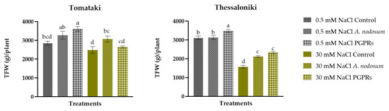 Impact of moderate salinity stress (30 mM NaCl) and plant biostimulants (PBs) on total fruit weight per plant (TFW) of the two Greek tomato landraces, ‘Tomataki’ (small-sized fruit size) and ‘Thessaloniki’ (mid-type fruit size). For each treatment, different letters at each bar indicate significant differences according to Duncan’s multiple range test (p < 0.05). Vertical bars indicate standard errors of means (n = 4).