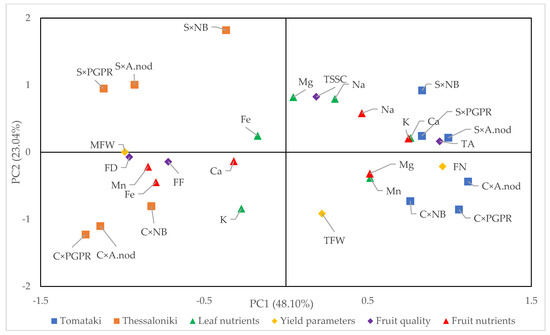 Scores and loading plots were generated to analyze the response of two Greek tomato landraces to the application of plant biostimulants (PBs) in the presence of moderate salinity stress induced under a 30 mM NaCl concentration in the root zone, in terms of yield parameters (TFW, FN and MFW), quality parameters (FD, TSSC, TA and FF), leaf nutrient concentrations (K, Na, Ca, Mg, Fe, and Mn), and fruit nutrient concentrations (K, Na, Ca, Mg, Fe, and Mn). C denotes control conditions (0.5 mM NaCl in the root zone), S denotes stress conditions (30 mM NaCl in the root zone), NB denotes no biostimulant application, A.nod denotes A. nodosum application, and PGPR denotes microbial biostimulant application.