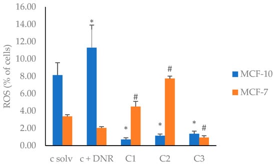ROS production in MCF-7 and MCF-10A cell lines induced by EF2 extract. c solv: solvent control (EtOH); c + DNR: daunorubicin; C1: 50 µg/mL; C2: 100 µg/mL; C3: 200 µg/mL. *, #: different symbols correspond to significant differences among treatments and c solv (p < 0.05).