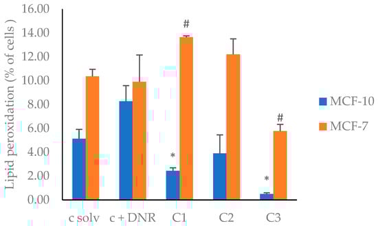 Lipid peroxidation in MCF-7 and MCF-10A cell lines induced by EF2 extract. c solv: solvent control (EtOH); c + DNR: daunorubicin; C1: 50 µg/mL; C2: 100 µg/mL; C3: 200 µg/mL. *, #: different symbols correspond to significant differences among treatments and c solv (p < 0.05).