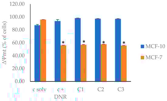 Mitochondrial membrane permeability (∆Ψmt) changes in MCF-7 and MCF-10A cell lines induced by EF2 extract. c solv: solvent control (EtOH); c + DNR: daunorubicin; C1: 50 µg/mL; C2: 100 µg/mL; C3: 200 µg/mL. * corresponds to significant differences among treatments and c solv.