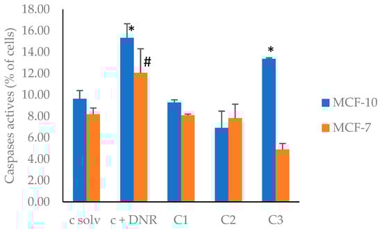 Caspase activation in MCF-7 and MCF-10A cell lines induced by EF2 extract. c solv: solvent control (EtOH); c + DNR: daunorubicin; C1: 50 µg/mL; C2: 100 µg/mL; C3: 200 µg/mL. *, #: different symbols correspond to significant differences among treatments and c solv.