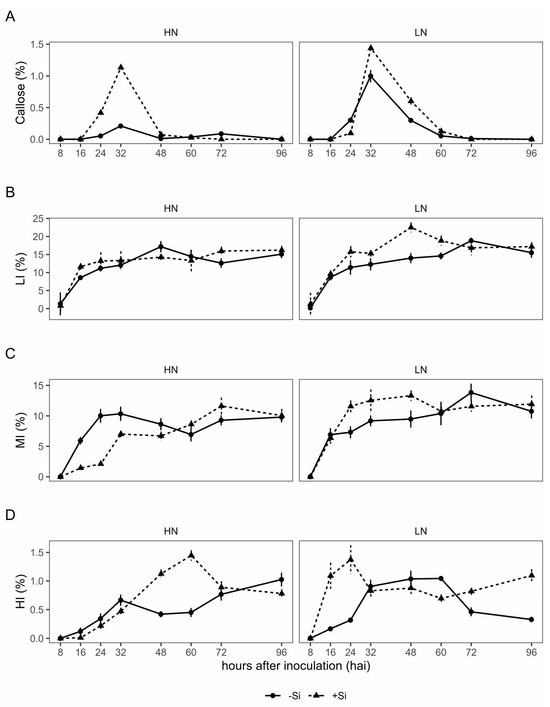 Callose deposition (A) and DAB reaction classified as low intensity (LI) (B), medium intensity (MI) (C) and high intensity (HI) (D) at hours after inoculation (hai) in the leaves of wheat plants grown in soil containing limestone (equivalent to 11.0 tons ha−1; −Si) or calcium silicate (equivalent to 13.2 tons ha−1; +Si) and low nitrogen (70 kg ha−1; LN) and high nitrogen (200 kg ha−1; HN) rates and inoculated with Pyrenophora tritici-repentis. Bars represent the standard deviation; n = 24.