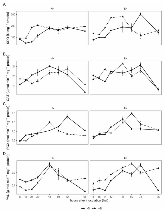 Activity of superoxide dismutase (SOD) (A), catalases (CAT) (B), peroxidases (POX) (C), and phenylalanine ammonia-lyase (PAL) (D) at hours after inoculation (hai) in the leaves of wheat plants grown in soil limestone (equivalent to 11.0 tons ha−1; −Si) or calcium silicate (equivalent to 13.2 tons ha−1; +Si) and low nitrogen (70 kg ha−1; LN) and high nitrogen (200 kg ha−1; HN) rates and inoculated with Pyrenophora tritici-repentis. Bars represent the standard deviation; n = 8.