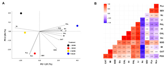 Biochemical variables and leaf Si concentration correlated negatively with N concentration (PC 1), while disease variables (FLS, NLs, and SEV) correlated positively and highly associated with PC 2. FLS, NLs, and SEV showed high association with −Si and LN plants, while +Si and LN plants had a high correlation with variables such as leaf Si concentration, PAL activity, LI and CAL mainly (Figure 3A). On the other hand, −Si and HN and +Si and HN plants showed a negative association with biochemical variables such as SOD, CAL, CAT, and MI (Figure 3A). The leaf’s N concentration had a negative correlation with PAL, CAT, and POX activities, as well as LI and MI. Meanwhile, PAL activity, leaf Si concentration, MI, HI, and LI were highly correlated. POX and CAT activities showed high correlation with MI (Figure 3B).