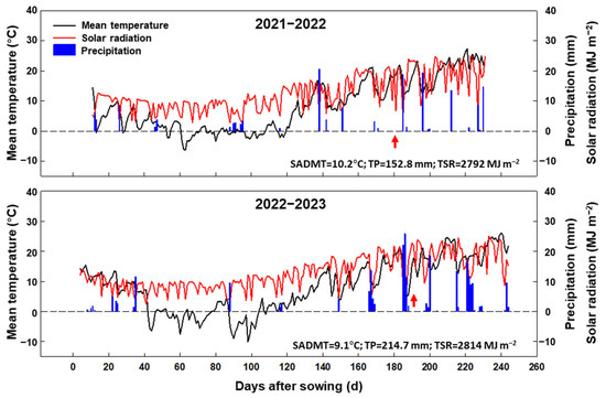 - Fan, Y.H.; Ma, L.L.; Yang, J.H.; Ding, W.J.; He, W.; Tang, Y.; Cui, G.J.; Zhang, W.J.; Ma, S.Y.; Ma, C.X.; et al. Night warming from tillering to jointing increases post-anthesis flag leaf photosynthetic capacity and wheat yield. Eur. J. Agron. 2023, 150, 126926. [Google Scholar] [CrossRef]