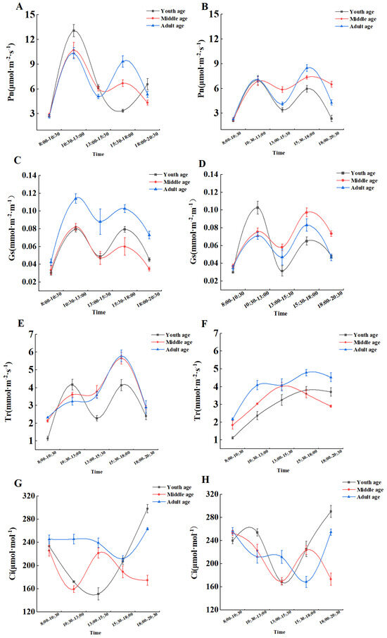 In the absence of the influence of great gerbils, the transpiration rate of H. ammodendron at each growth stage gradually increased and finally decreased between 6:00 p.m. and 10:30 p.m. Under the influence of gerbils, the transpiration rate of H. ammodendron at each growth stage showed two peaks: from 10:30 a.m. to 1:00 p.m. and from 3:30 p.m. to 6:00 p.m. Those of the middle and adult H. ammodendron plants peaked at 5.65 mmol·m−2·s−1 and 5.79 mmol·m−2·s−1 from 3:30 p.m. to 6:00 p.m., respectively, and the maximum value of the young H. ammodendron reached 4.17 mmol·m−2·s−1 from 10:30 a.m. to 1:00 p.m. (Figure 1E,F). The diurnal trend of the intercellular CO2 concentration in young and adult H. ammodendron before and after disturbance was essentially the same, whereas that in the middle-aged H. ammodendron was roughly the opposite (Figure 1G,H).
