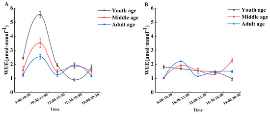 As shown in Figure 2, the disturbance by great gerbils significantly reduced the instantaneous water use efficiency of H. ammodendron at all ages. The overall change range in the instantaneous water use efficiency (WUE) was 1.546–2.534 μmol·mmol−1 in the absence of gerbil disturbance, while the overall change range in WUE was 1.414–1.648 μmol·mmol−1 under the influence of gerbils. Among them, the young H. ammodendron changed the most after disturbance by the gerbils, whereas the influence on the adult H. ammodendron was small.