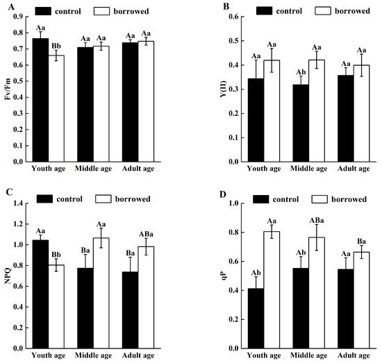 Influence of great gerbil disturbance on chlorophyll fluorescence parameters. (A) The maximum photochemical efficiency (Fv/Fm). (B) The actual photochemical efficiency (Y (II)). (C) The non-photochemical quenching coefficient (NPQ). (D) The photochemical quenching coefficient (qP). Different uppercase letters indicate that there were significant differences in the indexes of H. ammodendron at each growth stage (p < 0.5), and different lowercase letters indicate that there was a significant influence on H. ammodendron with or without great gerbil disturbance (p < 0.5).
