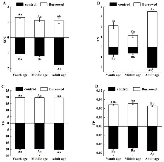 When there was no gerbil disturbance, the SOC, TN, TP, and TK contents in the whole rhizosphere soil of H. ammodendron in the three growth stages varied from 0.922 to 1.900 g·Kg−1, from 0.539 to 2.240 g·Kg−1, from 0.071 to 0.086 g·Kg−1, and from 19.541 to 20.512 g·Kg−1, respectively. The SOC, TN, TP and TK contents in the rhizosphere soil varied from 0.926 to 1.392 g·Kg−1, from 1.016 to 3.561 g·Kg−1, from 0.068 to 0.081 g·Kg−1, and from 19.425 to 19.992 g·Kg−1, respectively. The TN in the rhizosphere soil of the young, middle-aged, and adult H. ammodendron increased significantly (p < 0.05). The SOC and TP levels decreased in the adult H. ammodendron (Figure 4).