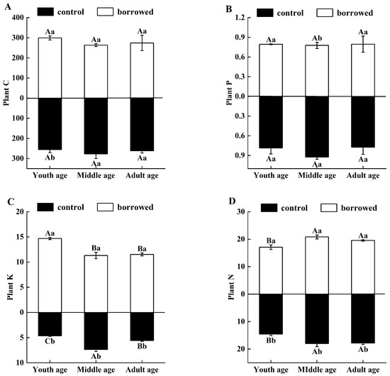 Effects of great gerbil disturbance on nutrient uptake. (A) Plant carbon (Plant C), (B) Plant phosphorus (Plant P). (C) Plant potassium (Plant K). (D) Plant nitrogen (Plant N). Different uppercase letters indicate that there were significant differences in the indexes of H. ammodendron at each growth stage (p < 0.5), and different lowercase letters indicate that there was a significant influence on H. ammodendron with or without great gerbil disturbance (p < 0.5).