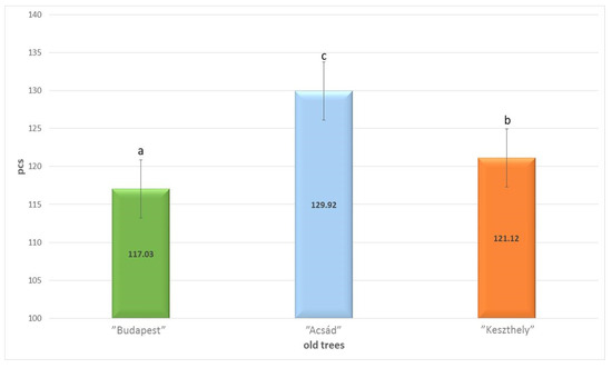 Examining the leaf data from different sections of the three historical Gingko biloba trees, it was found that the average numbers of stomata “Acsád” tree (129.92 (c) pcs) were significantly higher (p = 0.000) those of the “Budapest” tree (117.03 (a) pcs) and “Keszthely” trees (121.12 (b) pcs) (Figure 1).