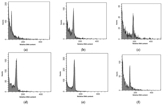 Flow cytometric analyses of Ginkgo biloba L. samples: histograms demonstrate the relative DNA content of (a) “Chris Dwarf”, haploid control; (b) seed-derived Gingko biloba L., diploid control; (c) “Knapek’s triploid”, triploid control; (d) “Acsád”; (e) “Budapest”; and (f) “Keszthely” samples.