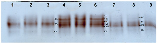Separation of the isoforms of class III peroxidases in Ginkgo biloba samples: 1–3: “Acsád”; 4–6: “Budapest”; and 7–9: “Keszthely”.