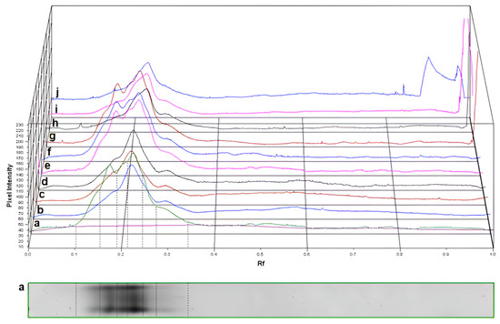 Unnormalized densitograms of class III activity-stained native polyacrylamide gel electrophoretograms of Ginkgo biloba samples: a: reference sample “Budapest”; b–d: “Acsád”; e–g: “Budapest”; h–j: “Keszthely”.