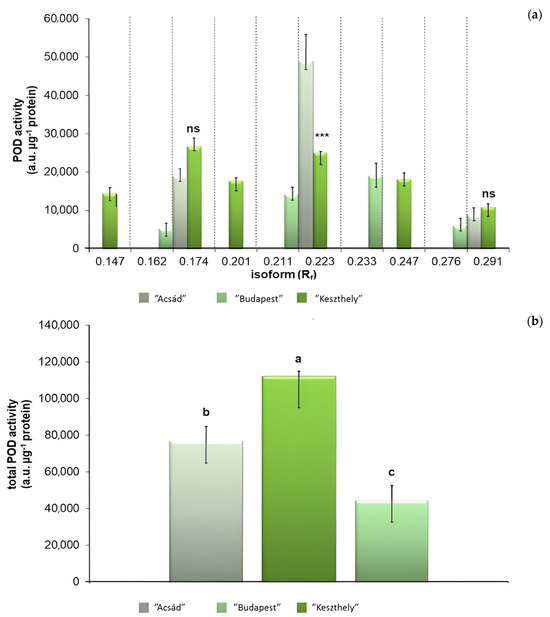 Class III peroxidase (POD) activity of the (a) separated isoforms, indicated by retention factors (Rf) and the total POD activity (b) in ‘“Acsád” (left), “Budapest” (middle), and “Keszthely” (right) samples. To compare differences, Student’s t test (a) and one-way ANOVA with Tukey–Kramer post hoc test (b) were performed (p < 0.05). On (a), asterisks indicate significant difference, and ns indicate not significant. On (b), letters indicate statistical groups.