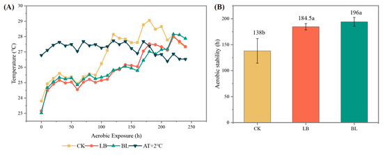 Dynamics of silage temperature (°C) (A) and aerobic stability (B) during aerobic exposure. Means with different lowercase letters (a,b) indicate significant differences in aerobic stability time (p < 0.05). AT + 2 °C represents ambient temperature plus 2 °C. CK represents silage without inoculation; LB represents silage with inoculation of Lactobacillus buchneri; BL represents silage with inoculation of Bacillus licheniformis.
