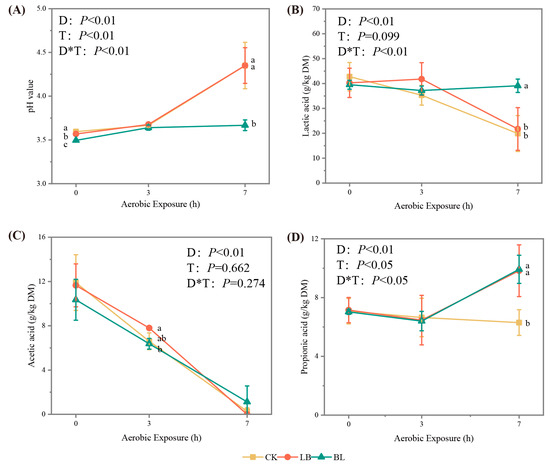 pH (A), lactic acid (B), acetic acid (C), and propanoic acid (D) of silage during aerobic exposure. Means with different lowercase letters (a,b) differ significantly (p < 0.05). D represents aerobic exposure days; T represents treatments; D*T represents interaction between treatments and aerobic exposure days. CK represents silage without inoculation; LB represents silage with inoculation of Lactobacillus buchneri; BL represents silage with inoculation of Bacillus licheniformis.