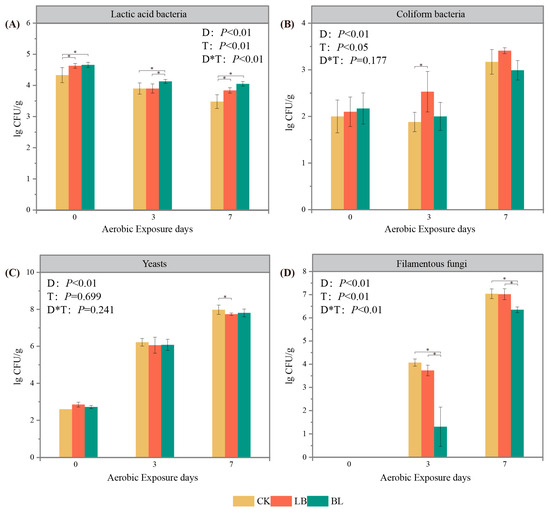 Lactic acid bacteria (A), coliform bacteria (B), yeasts (C), and filamentous fungi (D) of silage during aerobic exposure. * significance at p < 0.05. D represents aerobic exposure days; T represents treatments; D*T represents interaction between treatments and aerobic exposure days. CK represents silage without inoculation; LB represents silage with inoculation of Lactobacillus buchneri; BL represents silage with inoculation of Bacillus licheniformis.