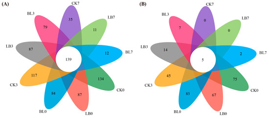 Venn diagram of bacterial (A) and fungal (B) OTUs in silage during aerobic exposure. CK0, CK3, and CK7 represent silage not inoculated at 0 d, 3 d, and 7 d of the aerobic exposure stage, respectively; LB0, LB3, and LB7 represent silage inoculated with Lactobacillus buchneri at 0 d, 3 d, and 7 d of the aerobic exposure stage, respectively; BL0, BL3, and BL7 represent silage inoculated with Bacillus licheniformis at 0 d, 3 d, and 7 d of the aerobic exposure stage, respectively.