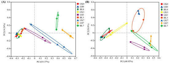 Principal coordinate analysis of bacterial (A) and fungal (B) communities in silage during aerobic exposure. CK0, CK3, and CK7 represent silage not inoculated at 0 d, 3 d, and 7 d of the aerobic exposure stage, respectively; LB0, LB3, and LB7 represent silage inoculated with Lactobacillus buchneri at 0 d, 3 d, and 7 d of the aerobic exposure stage, respectively; BL0, BL3, and BL7 represent silage inoculated with Bacillus licheniformis at 0 d, 3 d, and 7 d of the aerobic exposure stage, respectively.