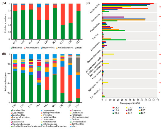 Changes of bacteria at the phylum level (A), genus level (B), and the differences in genus level (C). * significance at p < 0.05; ** significance at p < 0.01. CK0, CK3, and CK7 represent silage not inoculated at 0 d, 3 d, and 7 d of the aerobic exposure stage, respectively; LB0, LB3, and LB7 represent silage inoculated with Lactobacillus buchneri at 0 d, 3 d, and 7 d of the aerobic exposure stage, respectively; BL0, BL3, and BL7 represent silage inoculated with Bacillus licheniformis at 0 d, 3 d, and 7 d of the aerobic exposure stage, respectively.