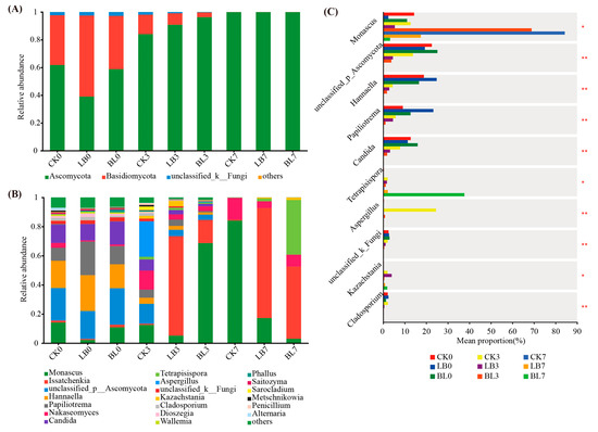 Changes in fungi at the phylum level (A), genus level (B), and the differences in genus level (C). * significance at p < 0.05; ** significance at p < 0.01. CK0, CK3, and CK7 represent silage not inoculated at 0 d, 3 d, and 7 d of the aerobic exposure stage, respectively; LB0, LB3, and LB7 represent silage inoculated with Lactobacillus buchneri at 0 d, 3 d, and 7 d of the aerobic exposure stage, respectively; BL0, BL3, and BL7 represent silage inoculated with Bacillus licheniformis at 0 d, 3 d, and 7 d of the aerobic exposure stage, respectively.