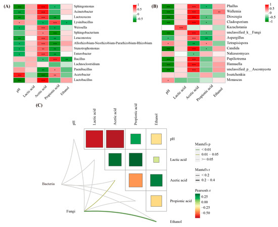 Spearman analysis between silage parameters and bacterial species (A), and fungal species (B) during aerobic exposure; Mantel tests were used to analyze the correlations of fermentation characteristics and the abundance of bacterial and fungal communities (C). * significance at p < 0.05; ** significance at p < 0.01; *** significance at p < 0.001.