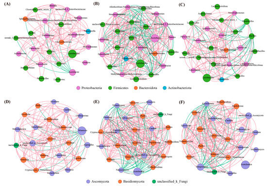 Interaction networks of the silage in bacterial (A–C) and fungal (D–F) communities. (A,C) represent silage not inoculated; (B,E) represent silage inoculated with Lactobacillus buchneri; (C,F) represent silage inoculated with Bacillus licheniformis. Node size and color represent the bacterial phylum and relative abundance, respectively; the edges are colored based on negative (green) and positive (red) correlations.
