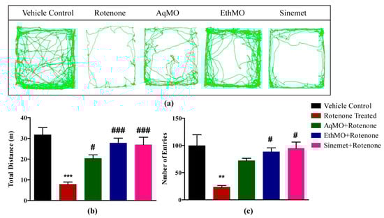 MO seed extracts maintain the exploratory activities of rotenone-inflicted mice. (a) Open-field trajectories of mice exploratory activity revealed a reduction in locomotor activity of mice in rotenone treatment group; however, a higher extent of locomotor activity was observed in MO extract-treated and Sinemet-treated groups. (b) A significant reduction in total distance (m) traveled by rotenone-treated mice compared to control was prevented significantly in extract-treated and Sinemet-treated groups. (c) The reduced number of entries in marked floor of open field was ameliorated in ethanolic MO seed extract and Sinemet groups. Data are represented as mean ± SEM; n = 6/group. ** p < 0.01, *** p < 0.001 vs. vehicle control; # p < 0.05, ### p < 0.001 vs. rotenone treated. One-way ANOVA followed by Bonferroni post hoc analysis.